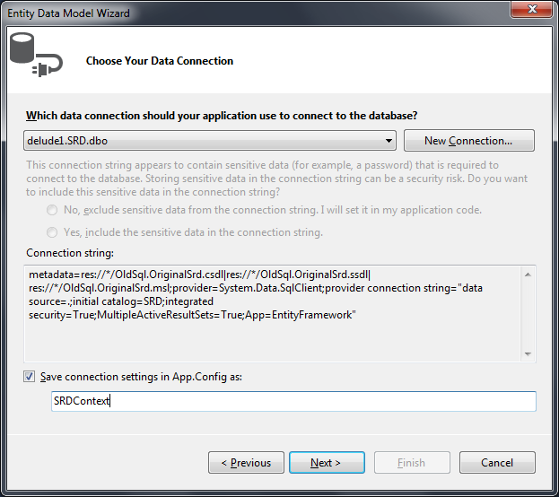 After you click Next, you’ll need to choose the connection. Click New Connection and connect to the database you ran the scripts against. It should have the tables, with data. I prefer to change the connection setting name (on the bottom) to something-Context. That will make more sense when we do the code first method later.