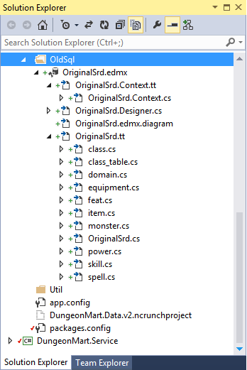 Since I already have a database, I’m going to use Entity Framework’s database first model to get talking to it quickly. I know from playing with this database already that it’s not even close to the linked, relational type data that I want. In fact, it’s so far from that database that I’m only hooking up to it in order to get the data in place so I can start a new database from scratch. In order to isolate this first database, I created a new folder in the data project and called it OldSql. Then I set about creating the database first model.