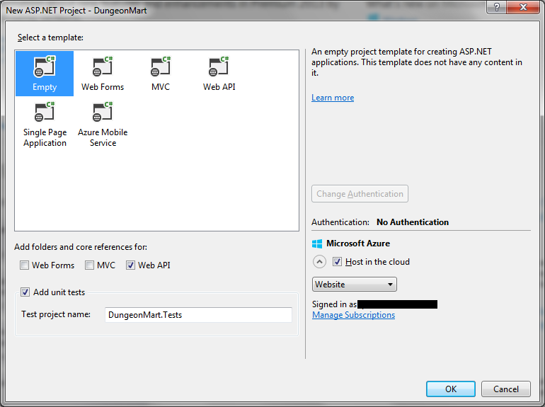 These templates are where all the bloat that I hate so much comes from. So I always pick empty, and then add the core references I want using the checkboxes below the template list. Since the UI will be AngularJS, and not MVC with Razor, I did not choose the MVC checkbox.